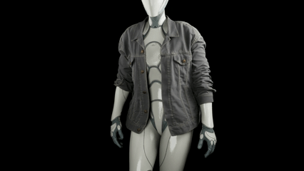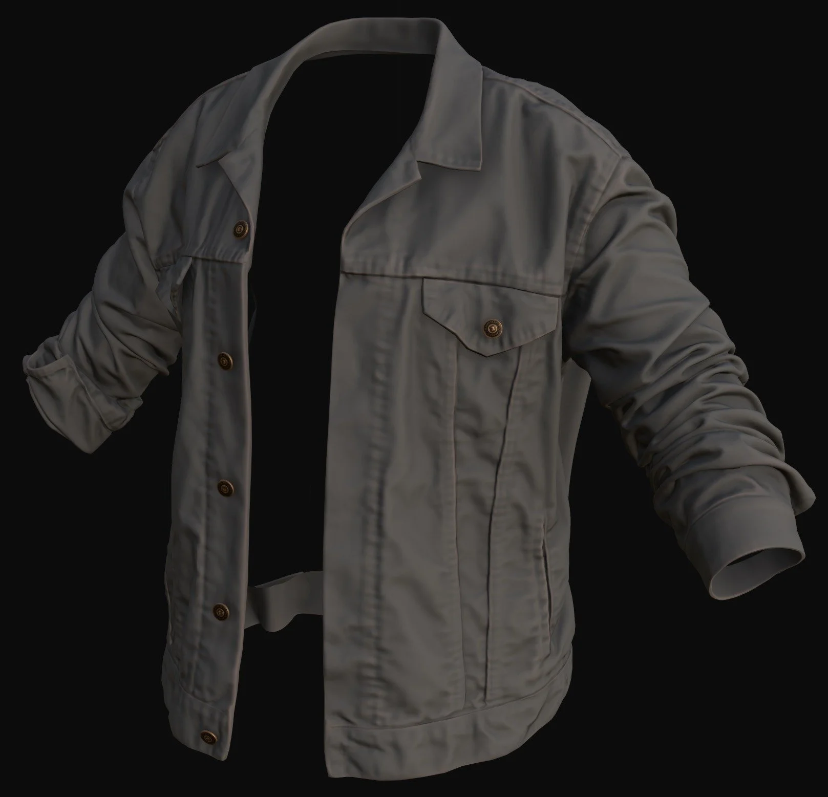 The project called for a uniquely textured, denim jacket-type garment. The jacket was to look slightly too big on a female character, as she is wearing the oversized jacket of her larger male partner. The sleeves were to be rolled up haphazardly as the sleeves would be too long for her. The jacket should be open so that the outfit below can be seen. The budget is small, and they do not have time for clothing simulation.